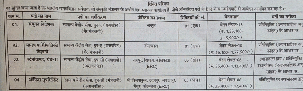 रायपुर 8 दिसंबर 2025/ ETrendingIndia / Anthropological Survey of India invites applications for 10 vacancies: Jagdalpur, Nagpur and Udaipur posts also included / Anthropological Survey भर्ती 2025 , संस्कृति मंत्रालय के अधीन भारतीय मानवविज्ञान सर्वेक्षण (Anthropological Survey of India) कोलकाता द्वारा निम्नानुसार चार पदों के 10 रिक्तियों लिए पात्र आवेदकों से आवेदन पत्र आमंत्रित हैं-