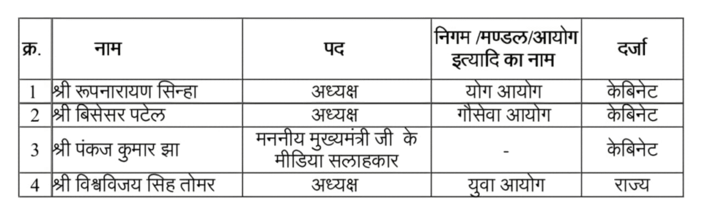 निगम ,मंडल, आयोग इत्यादि के अध्यक्ष, उपाध्यक्ष को केबिनेट मंत्री दर्जा प्रदान किया है –
