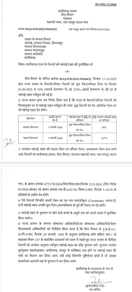 रायपुर, 8 अप्रैल 2026/ ETrendingIndia / Inflation relief for Chhattisgarh pensioners up 3% / पेंशन महंगाई राहत बढ़ोतरी , छत्तीसगढ़ शासन के वित्त विभाग ने राज्य के पेंशनरों और पारिवारिक पेंशनरों को महंगाई राहत (DR) में बढ़ोतरी का आदेश जारी किया है। नए आदेश के अनुसार 1 जनवरी 2026 से संशोधित दरें लागू होंगी।