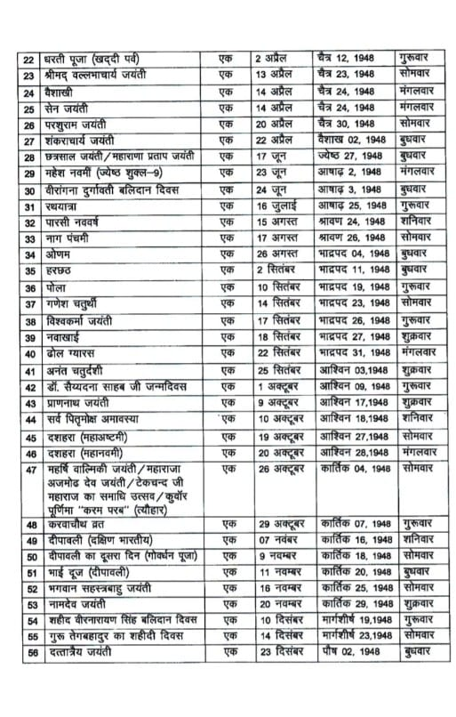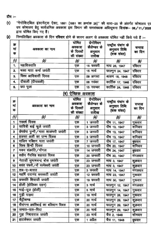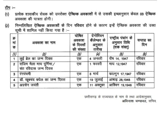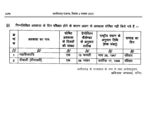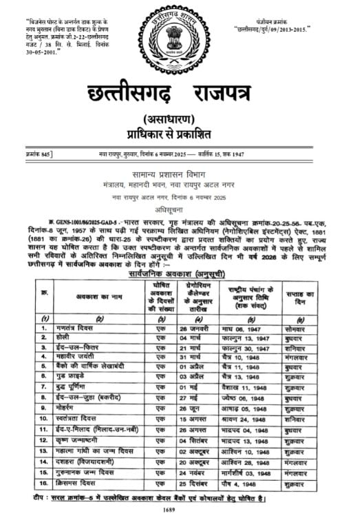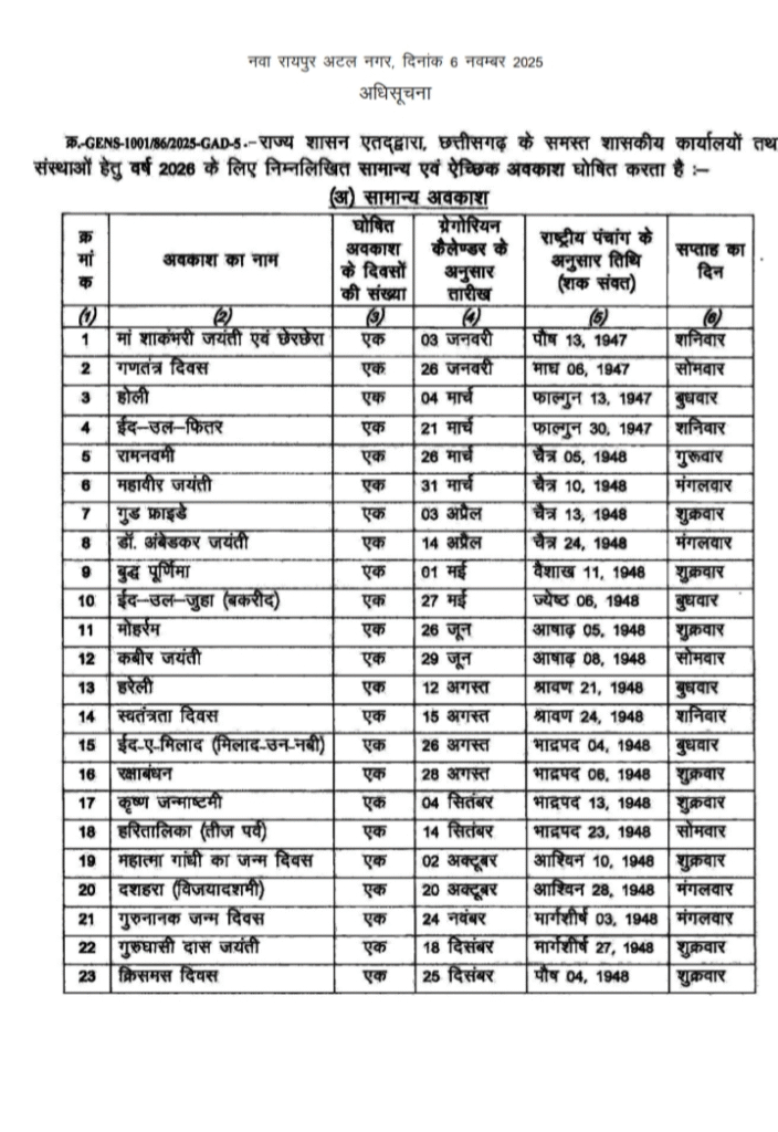 ये अवकाश राज्य के सभी शासकीय कार्यालयों, संस्थानों और उपक्रमों में लागू होंगे। यह अधिसूचना 6 नवम्बर 2025 को नवा रायपुर अटल नगर से प्रकाशित छत्तीसगढ़ राजपत्र (असाधारण) में जारी की गई है।