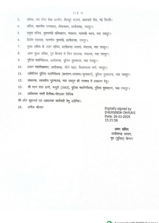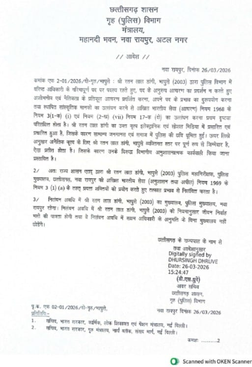 रायपुर 26 मार्च 2026 / ETrendingIndia / Chhattisgarh cadre DIG Ratan Lal Dangi suspended: No conduct in accordance with the post, indecent and morality / DIG रतन लाल डांगी निलंबित , छत्तीसगढ़ शासन के गृह (पुलिस) विभाग भारतीय पुलिस सेवा के 2003 कैडर के अधिकारी तथा पुलिस महानिरीक्षक श्री रतन लाल डांगी को तत्काल प्रभाव से निलंबित कर दिया है.