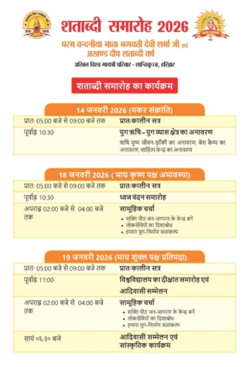 रायपुर 18 जनवरी 2026/ ETrendingIndia / A grand celebration of the Centenary Celebration 2026 in Haridwar: Mahakumbh of spiritual consciousness, know the programs for different days/ हरिद्वार शताब्दी समारोह 2026 , हरिद्वार स्थित गायत्री तीर्थ–शांतिकुंज में 14 से 24 जनवरी 2026 तक शताब्दी समारोह 2026 का भव्य आयोजन किया जा रहा है। यह आयोजन परम वंदनीय माता भगवती देवी शर्मा जी के शताब्दी वर्ष तथा अखंड दीप के सौ वर्ष पूर्ण होने के उपलक्ष्य में आयोजित हो रहा है।