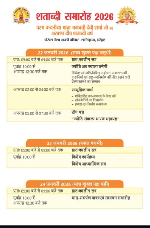 24 जनवरी को मातृ-समर्पण यात्रा एवं समापन समारोह के साथ यह ऐतिहासिक आयोजन पूर्ण होगा। यह शताब्दी समारोह केवल एक उत्सव नहीं, बल्कि युग निर्माण का संकल्प है। इसकी गरिमा, भव्यता और महत्व देश-विदेश से आने वाले लाखों साधकों को नैतिकता, सेवा और अध्यात्म के मार्ग पर प्रेरित करेगा। यह आयोजन भारतीय संस्कृति की जीवंत शक्ति और मानवता के उज्ज्वल भविष्य का संदेश देगा।
