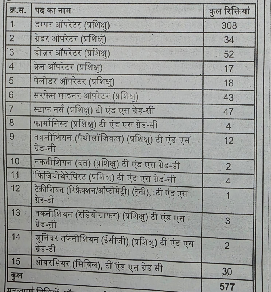 इन पदों में विभिन्न श्रेणियों के HEMM ऑपरेटर (ट्रेनी), अलग-अलग वर्गों के पैरामेडिकल स्टाफ और ओवरसियर (सिविल) शामिल हैं। इन पदों पर चयनित उम्मीदवारों को मध्य प्रदेश के सिंगरौली जिले और उत्तर प्रदेश के सोनभद्र जिले में स्थित NCL की खदानों, प्रतिष्ठानों, अस्पतालों और औषधालयों में तैनात किया जाएगा। कुल रिक्तियों की संख्या इस प्रकार है –