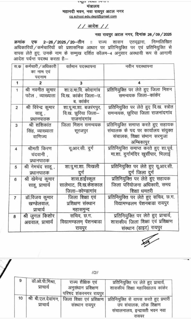 रायपुर, 28 सितंबर 2025/ ETrendingIndia / 10 new postings after withdrawing them from deputation in the School Education Department / स्कूल शिक्षा विभाग पदस्थापना , राज्य शासन के स्कूल शिक्षा विभाग द्वारा 10 अधिकारियों/कर्मचारियों को प्रशासनिक आधार पर प्रतिनियुक्ति पर एवं प्रतिनियुक्ति से वापस लेते हुए नवीन पदस्थापना की गई है.