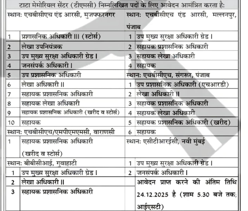 रायपुर 15 दिसंबर 2025 / ETrendingIndia / Tata Memorial Centre invites applications for various posts at various locations; last date is December 24 / टाटा मेमोरियल सेंटर भर्ती , टाटा मेमोरियल सेंटर (TMC) परमाणु ऊर्जा विभाग, भारत सरकार के अधीन एक सहायता अनुदान संस्था है. इसने विज्ञापन सं.टीएमसी/एडी-151/2025 जारी कर मुजफ्फरनगर ,मल्लनपुर, वाराणसी, नवी मुंबई और गुवाहाटी के लिए विभिन्न पदों हेतु आवेदन पत्र आमंत्रित किए हैं. पदों का विवरण निम्नानुसार-